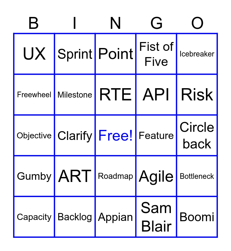 This bingo card has a free space and 34 words: Dependencies, Sam Blair, Ruby Dease, With that said, Gumby, Milestone, Icebreaker, Capacity, Sprint, Scrum Master/Team Coach, RTE, Point, Lunch, Parking Lot, Feature, Risk, Backlog, Objective, ART, Agile, Roadmap, SAFe, UX, Circle back, Appian, Boomi, Fist of Five, Testing/QA, API, Freewheel, Refine, Clarify, Bottleneck and Sticky.