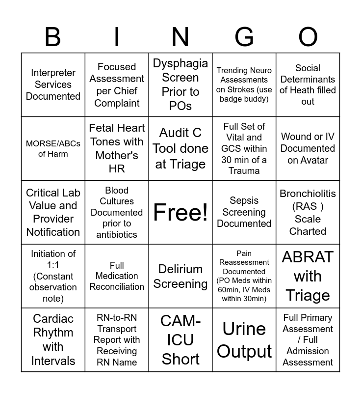 This bingo card has a free space and 27 words: Pain Reassessment Documented (PO Meds within 60min, IV Meds within 30min), EKG Obtained and Charted within 10 min of arrival, Full Set of Vital and GCS within 30 min of a Trauma, CAM-ICU Short, MORSE/ABCs of Harm, Dysphagia Screen Prior to POs, Focused Assessment per Chief Complaint, Initiation of 1:1 (Constant observation note), Sepsis Screening Documented, ABRAT with Triage, Critical Lab Value and Provider Notification, Trending Neuro Assessments on Strokes (use badge buddy), Cardiac Rhythm with Intervals, RN-to-RN Transport Report with Receiving RN Name, Wound or IV Documented on Avatar, NIHSS, Fetal Heart Tones with Mother's HR, Audit C Tool done at Triage, Full Medication Reconciliation, Interpreter Services Documented, Bronchiolitis (RAS ) Scale Charted, Urine Output, Blood Cultures Documented prior to antibiotics, Full Primary Assessment / Full Admission Assessment, Delirium Screening, Social Determinants of Heath filled out and Food Bag .phrase used.