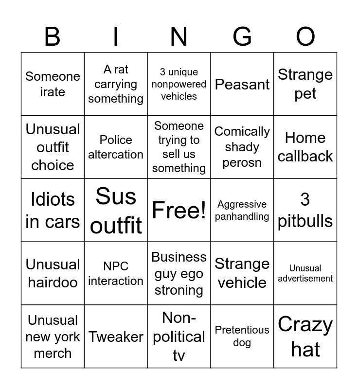 This bingo card has a free space and 24 words: NPC interaction, Tweaker, Someone trying to sell us something, Unusual new york merch, Strange pet, Someone irate, Unusual outfit choice, A rat carrying something, Aggressive panhandling, Business guy ego stroning, Comically shady perosn, Idiots in cars, Strange vehicle, Unusual advertisement, Police altercation, Pretentious dog, 3 pitbulls, 3 unique nonpowered vehicles, Home callback, Sus outfit, Crazy hat, Unusual hairdoo, Peasant and Non-political tv.