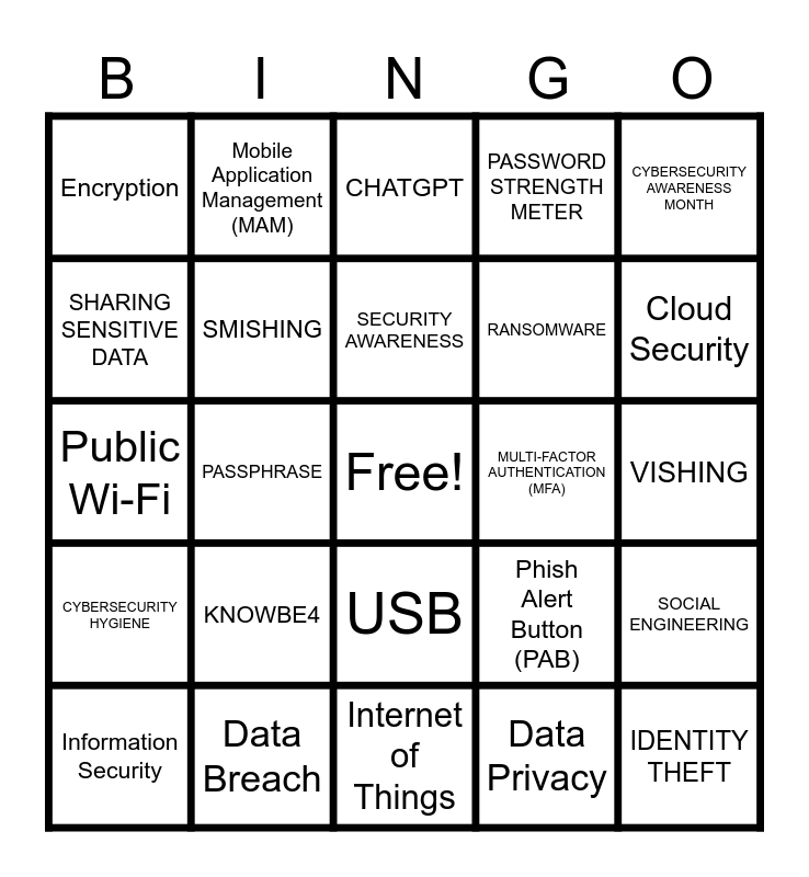 This bingo card has a free space and 38 words: BUSINESS EMAIL COMPROMISE (BEC), MALWARE, PHISHING, SMISHING, SOCIAL ENGINEERING, KNOWBE4, SECURITY AWARENESS, ANNUAL SECURITY TRAINING, CYBERSECURITY AWARENESS MONTH, RANSOMWARE, PASSPHRASE, PASSWORD STRENGTH METER, IDENTITY THEFT, VISHING, SHARING SENSITIVE DATA, CYBERSECURITY HYGIENE, PASSWORD SPRAYING, CHATGPT, ARTIFICIAL INTELLIGENCE, MULTI-FACTOR AUTHENTICATION (MFA), Encryption, Data Breach, Cloud Security, Information Security, Hacker, Internet of Things, Spoofing, Trojan Horse, VPN (Virtual Private Network), Virus, Social Media Scams, USB, Data Privacy, Mobile Application Management (MAM), QR Code Scams, Phish Alert Button (PAB), Public Wi-Fi and PolicyTech.