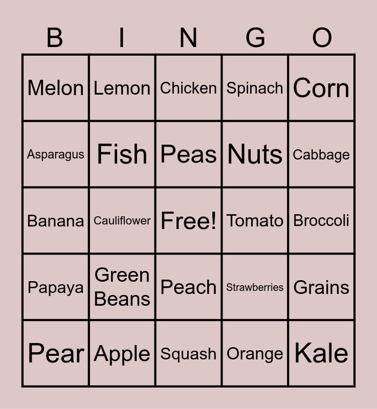 This bingo card has a free space and 24 words: Green Beans, Apple, Peas, Pear, Corn, Melon, Asparagus, Lemon, Tomato, Peach, Nuts, Banana, Strawberries, Grains, Fish, Orange, Broccoli, Chicken, Cabbage, Cauliflower, Kale, Papaya, Spinach and Squash.