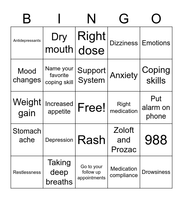 This bingo card has a free space and 24 words: Depression, Taking deep breaths, Support System, Restlessness, Emotions, Antidepressants, Mood changes, Dry mouth, Right medication, Rash, Anxiety, Weight gain, Zoloft and Prozac, 988, Name your favorite coping skill, Medication compliance, Put alarm on phone, Right dose, Coping skills, Increased appetite, Drowsiness, Stomach ache, Dizziness and Go to your follow up appointments.