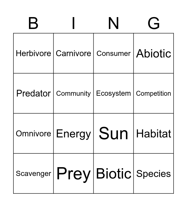 This bingo card has 20 words: Habitat, Producer, Consumer, Decomposer, Scavenger, Predator, Prey, Herbivore, Omnivore, Carnivore, Energy, Sun, Community, Species, Ecosystem, Interdependence, Competition, Abiotic, Biotic and Photosynthesis.