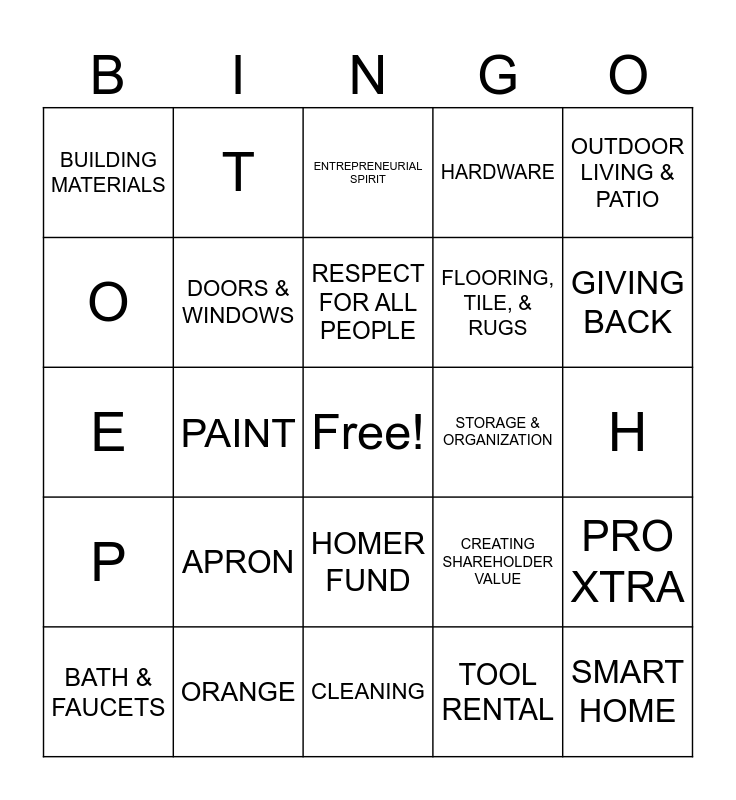 This bingo card has a free space and 57 words: APPLIANCES, BATH & FAUCETS, BLINDS & WINDOWS TREATEMENTS, BUILDING MATERIALS, CLEANING, DECOR & FURNITURE, DOORS & WINDOWS, ELECTRICAL, FLOORING, TILE, & RUGS, GARAGE, HARDWARE, HEATING, COOLING & AIR, HOLIDAY DECORATIONS, KITCHEN & KITCHENWARE, LAWN & GARDEN, LIGHTING & CEILING FANS, OUTDOOR LIVING & PATIO, PAINT, PLUMBING, SMART HOME, STORAGE & ORGANIZATION, TOOLS, CREATING SHAREHOLDER VALUE, ENTREPRENEURIAL SPIRIT, TAKING CARE OF OUR PEOPLE, RESPECT FOR ALL PEOPLE, DOING THE RIGHT THING, BUILDING STRONG RELATIONSHIPS, GIVING BACK, EXCELLENT CUSTOMER SERVICE, PRICING, MERCH IT, HOMER, THD, H, O, M, E, D, P, T, HOMER FUND, GET IN THE STORES, MPULSE, PACMAN, VSS, APRON, ORANGE, 12 FOOT SKELETON, PRO, HOW DOERS GET MORE DONE, TOOL RENTAL, TRUCK RENTAL, DIY, SPRING BLACK FRIDAY, PRO XTRA and HDX.