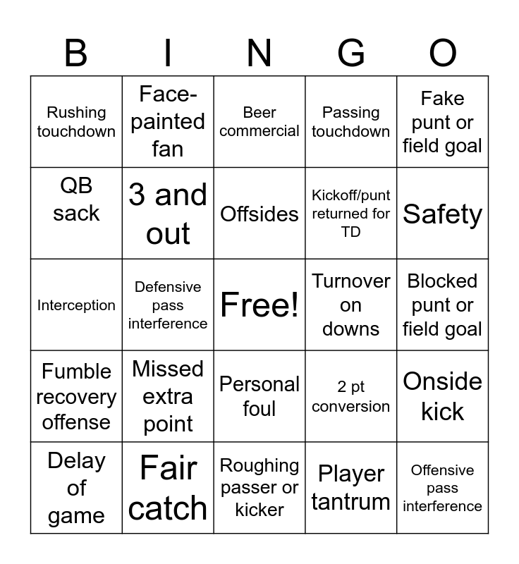 This bingo card has a free space and 36 words: Missed field goal, Fumble recovery defense, 4th down conversion, 3 and out, 2 pt conversion, Fumble recovery offense, Offsides, Coach's challenge, Fake punt or field goal, False start, Defensive pass interference, Passing touchdown, Injury timeout, Turnover on downs, Safety, Rushing touchdown, Coach yells at official, Missed extra point, Offensive pass interference, Beer commercial, Blocked punt or field goal, Onside kick, Fair catch, Delay of game, Roughing passer or kicker, Face-painted fan, Interception, Sideline worker knocked down, Kickoff/punt returned for TD, QB sack, Car commercial, Field goal 50 yds or more, Player tantrum, Personal foul, Insurance commercial and Pick 6.