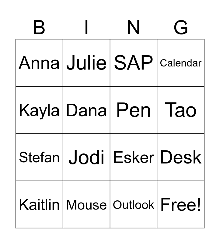 This bingo card has 23 words: Free!, Mirka, Tao, Chris, Kayla, Anna, Dana, Julie, Kaitlin, Pam, Jodi, Stefan, Computer, Keyboard, Mouse, Headset, SAP, Esker, Pen, Desk, Calendar, Outlook and Teams.