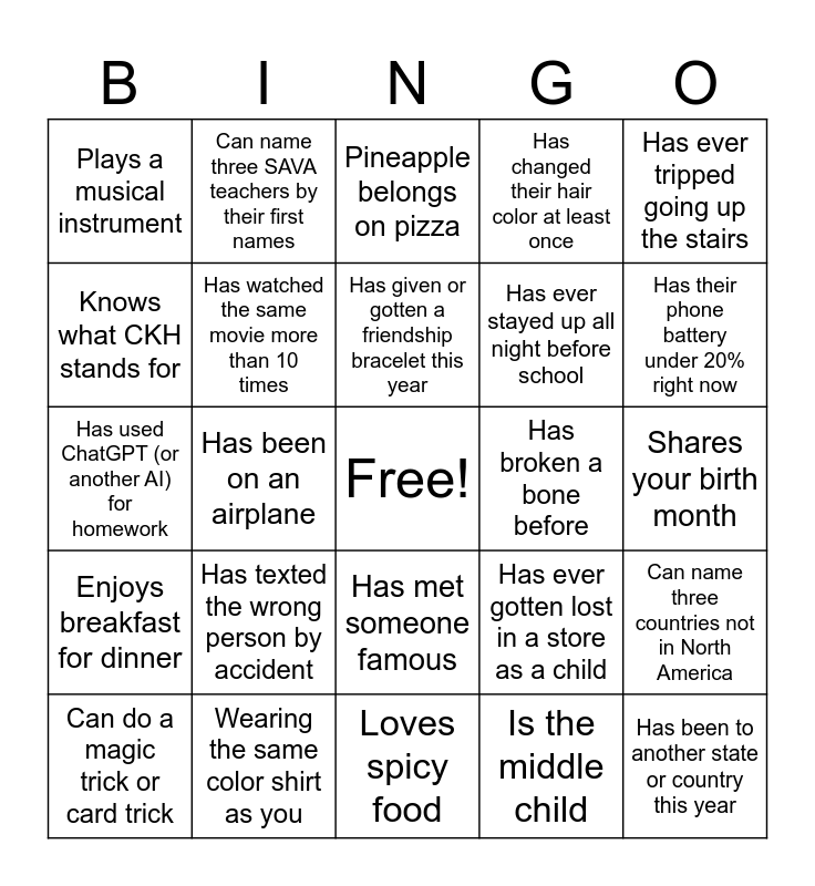 This bingo card has a free space and 30 words: Wearing the same color shirt as you, Can speak more than one language, Has been on an airplane, Has a pet that isn’t a dog or cat, Plays a musical instrument, Pineapple belongs on pizza, Has watched the same movie more than 10 times, Has met someone famous, Has broken a bone before, Loves spicy food, Shares your birth month, Has been to another state or country this year, Is the middle child, Has binge-watched a whole season in one day, Has their phone battery under 20% right now, Owns more than five hoodies, Has ever gotten lost in a store as a child, Enjoys breakfast for dinner, Has texted the wrong person by accident, Has ever tripped going up the stairs, Has used ChatGPT (or another AI) for homework, Owns Crocs or slides, Can name three SAVA teachers by their first names, Has ever stayed up all night before school, Knows what CKH stands for, Has changed their hair color at least once, Can name three countries not in North America, Can do a magic trick or card trick, Has given or gotten a friendship bracelet this year and Sleeps with their socks on.