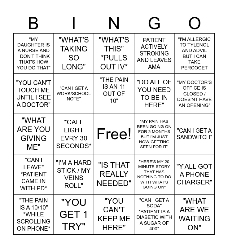 This bingo card has a free space and 24 words: "I'M A HARD STICK / MY VEINS ROLL", "YOU GET 1 TRY", "THE PAIN IS AN 11 OUT OF 10", "THE PAIN IS A 10/10" *WHILE SCROLLING ON PHONE*, "I'M ALLERGIC TO TYLENOL AND ADVIL BUT I CAN TAKE PERCOCET, "MY DAUGHTER IS A NURSE AND I DON'T THINK THAT'S HOW YOU DO THAT", "YOU CAN'T TOUCH ME UNTIL I SEE A DOCTOR", "WHAT'S TAKING SO LONG", "MY PAIN HAS BEEN GOING ON FOR 3 MONTHS BUT I'M JUST NOW GETTING SEEN FOR IT", "IS THAT REALLY NEEDED", "DO ALL OF YOU NEED TO BE IN HERE", "WHAT ARE YOU GIVING ME", "HERE'S MY 20 MINUTE STORY THAT HAS NOTHING TO DO WITH WHAT'S GOING ON", "Y'ALL GOT A PHONE CHARGER", "CAN I GET A WORK/SCHOOL NOTE", "CAN I GET A SODA" *PATIENT IS A DIABETIC WITH A SUGAR OF 400", "CAN I GET A SANDWITCH", "WHAT'S THIS" *PULLS OUT IV*, "MY DOCTOR'S OFFICE IS CLOSED / DOES'NT HAVE AN OPENING", *CALL LIGHT EVRY 30 SECONDS*, "WHAT ARE WE WAITING ON", "CAN I LEAVE" *PATIENT CAME IN WITH PD*, PATIENT ACTIVELY STROKING AND LEAVES AMA and "YOU CAN'T KEEP ME HERE".