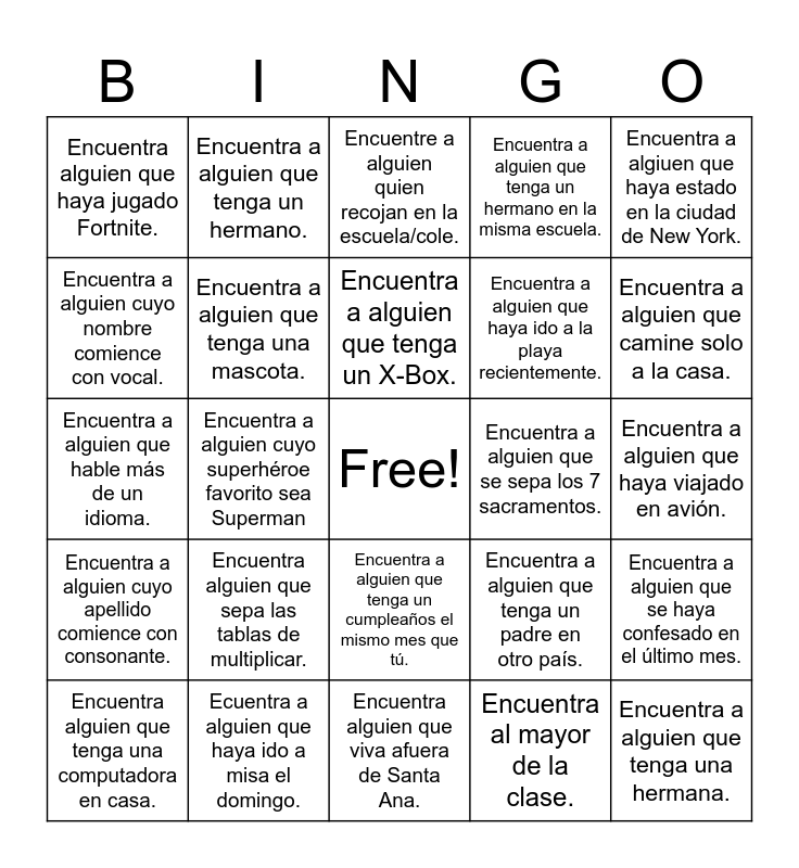 This bingo card has a free space and 24 words: Encuentra alguien que sepa las tablas de multiplicar., Ecuentra a alguien que haya ido a misa el domingo., Encuentra a alguien que tenga un X-Box., Encuentra alguien que tenga una computadora en casa., Encuentra a algiuen que haya estado en la ciudad de New York., Encuentra alguien que haya jugado Fortnite., Encuentra a alguien cuyo nombre comience con vocal., Encuentra a alguien que tenga un hermano., Encuentra a alguien que se sepa los 7 sacramentos., Encuentra a alguien que tenga un cumpleaños el mismo mes que tú., Encuentra a alguien que haya ido a la playa recientemente., Encuentra a alguien que hable más de un idioma., Encuentra a alguien que tenga un padre en otro país., Encuentra a alguien que se haya confesado en el último mes., Encuentra a alguien que tenga una mascota., Encuentra al mayor de la clase., Encuentra a alguien que haya viajado en avión., Encuentre a alguien quien recojan en la escuela/cole., Encuentra a alguien que camine solo a la casa., Encuentra a alguien cuyo superhéroe favorito sea Superman, Encuentra a alguien que tenga una hermana., Encuentra a alguien cuyo apellido comience con consonante., Encuentra a alguien que tenga un hermano en la misma escuela. and Encuentra alguien que viva afuera de Santa Ana..