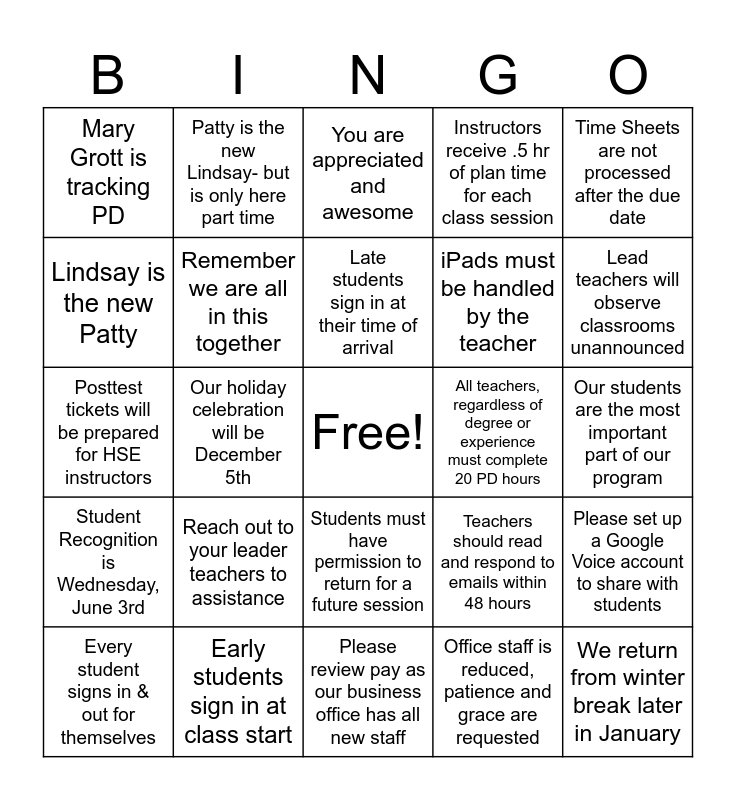 This bingo card has a free space and 24 words: Reach out to your leader teachers to assistance, Early students sign in at class start, Late students sign in at their time of arrival, Every student signs in & out for themselves, Time Sheets are not processed after the due date, Mary Grott is tracking PD, Lindsay is the new Patty, Patty is the new Lindsay- but is only here part time, All teachers, regardless of degree or experience must complete 20 PD hours, Students must have permission to return for a future session, iPads must be handled by the teacher, Posttest tickets will be prepared for HSE instructors, Teachers should read and respond to emails within 48 hours, Please set up a Google Voice account to share with students, Remember we are all in this together, Office staff is reduced, patience and grace are requested, Our students are the most important part of our program, You are appreciated and awesome, Lead teachers will observe classrooms unannounced, Our holiday celebration will be December 5th, We return from winter break later in January, Student Recognition is Wednesday, June 3rd, Instructors receive .5 hr of plan time for each class session and Please review pay as our business office has all new staff.