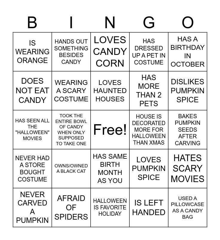 This bingo card has a free space and 24 words: OWNS/OWNED A BLACK CAT, AFRAID OF SPIDERS, LOVES HAUNTED HOUSES, NEVER CARVED A PUMPKIN, HAS A BIRTHDAY IN OCTOBER, IS WEARING ORANGE, DOES NOT EAT CANDY, HANDS OUT SOMETHING BESIDES CANDY, HOUSE IS DECORATED MORE FOR HALLOWEEN THAN XMAS, HAS SAME BIRTH MONTH AS YOU, HAS MORE THAN 2 PETS, HAS SEEN ALL THE "HALLOWEEN" MOVIES, LOVES PUMPKIN SPICE, HATES SCARY MOVIES, WEARING A SCARY COSTUME, IS LEFT HANDED, BAKES PUMPKIN SEEDS AFTER CARVING, LOVES CANDY CORN, DISLIKES PUMPKIN SPICE, TOOK THE ENTIRE BOWL OF CANDY WHEN ONLY SUPPOSED TO TAKE ONE, USED A PILLOWCASE AS A CANDY BAG, NEVER HAD A STORE BOUGHT COSTUME, HAS DRESSED UP A PET IN COSTUME and HALLOWEEN IS FAVORITE HOLIDAY.