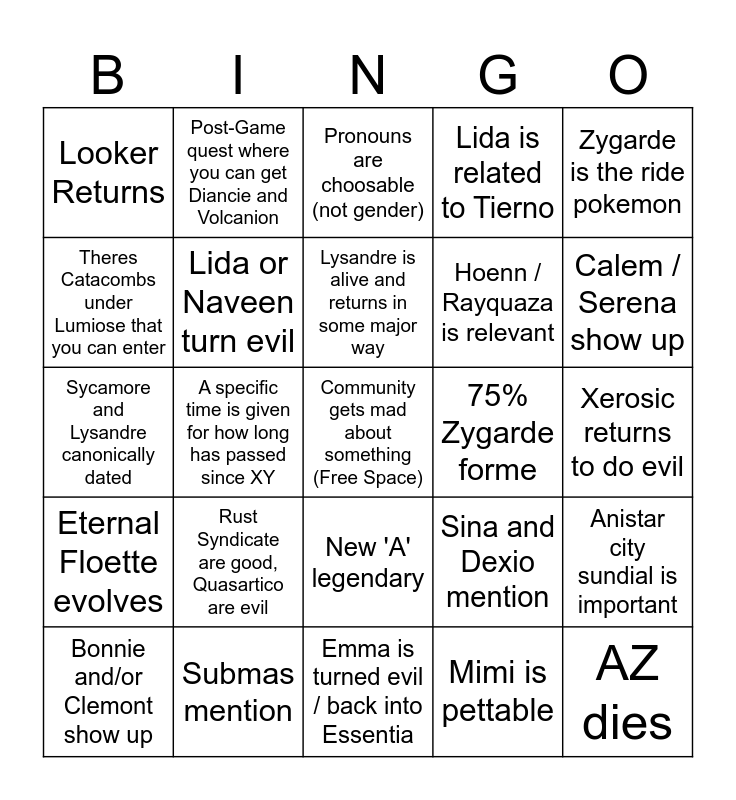 This bingo card has a free space and 24 words: Rust Syndicate are good, Quasartico are evil, Submas mention, Lysandre is alive and returns in some major way, Bonnie and/or Clemont show up, Zygarde is the ride pokemon, Looker Returns, Theres Catacombs under Lumiose that you can enter, Post-Game quest where you can get Diancie and Volcanion, 75% Zygarde forme, New 'A' legendary, Hoenn / Rayquaza is relevant, Sycamore and Lysandre canonically dated, Sina and Dexio mention, Anistar city sundial is important, Lida or Naveen turn evil, Mimi is pettable, Xerosic returns to do evil, Pronouns are choosable (not gender), Calem / Serena show up, A specific time is given for how long has passed since XY, AZ dies, Eternal Floette evolves, Lida is related to Tierno and Emma is turned evil / back into Essentia.
