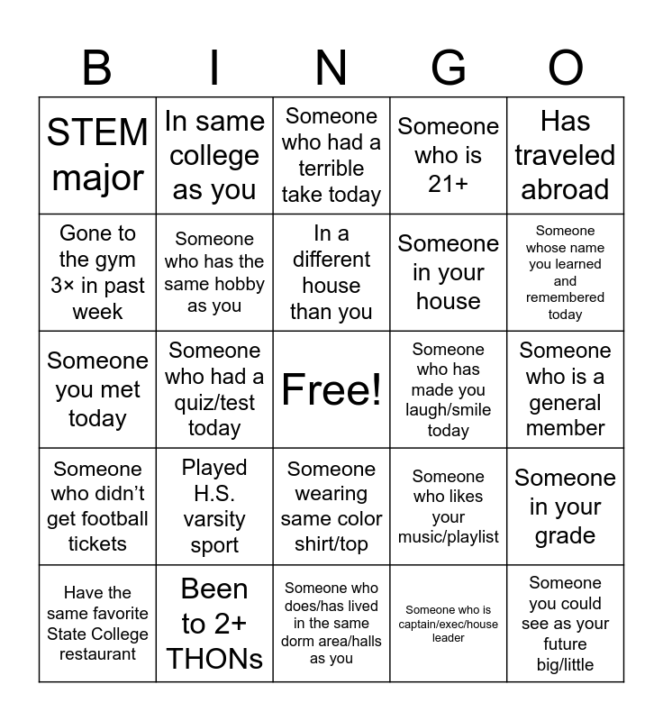 This bingo card has a free space and 24 words: Played H.S. varsity sport, Been to 2+ THONs, In a different house than you, Have the same favorite State College restaurant, Has traveled abroad, STEM major, Gone to the gym 3× in past week, In same college as you, Someone who has made you laugh/smile today, Someone wearing same color shirt/top, Someone in your house, Someone you met today, Someone who likes your music/playlist, Someone in your grade, Someone who has the same hobby as you, Someone who is captain/exec/house leader, Someone who is a general member, Someone who had a terrible take today, Someone whose name you learned and remembered today, Someone who had a quiz/test today, Someone you could see as your future big/little, Someone who didn’t get football tickets, Someone who is 21+ and Someone who does/has lived in the same dorm area/halls as you.