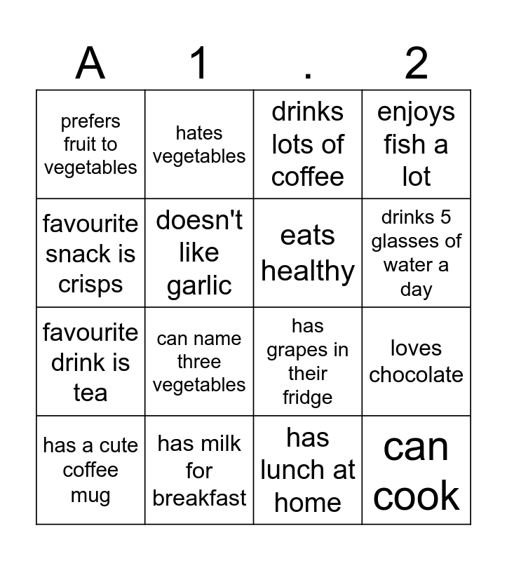 This bingo card has 16 words: has milk for breakfast, loves chocolate, drinks lots of coffee, prefers fruit to vegetables, favourite drink is tea, hates vegetables, has grapes in their fridge, has lunch at home, favourite snack is crisps, doesn't like garlic, has a cute coffee mug, enjoys fish a lot, can name three vegetables, drinks 5 glasses of water a day, eats healthy and can cook.