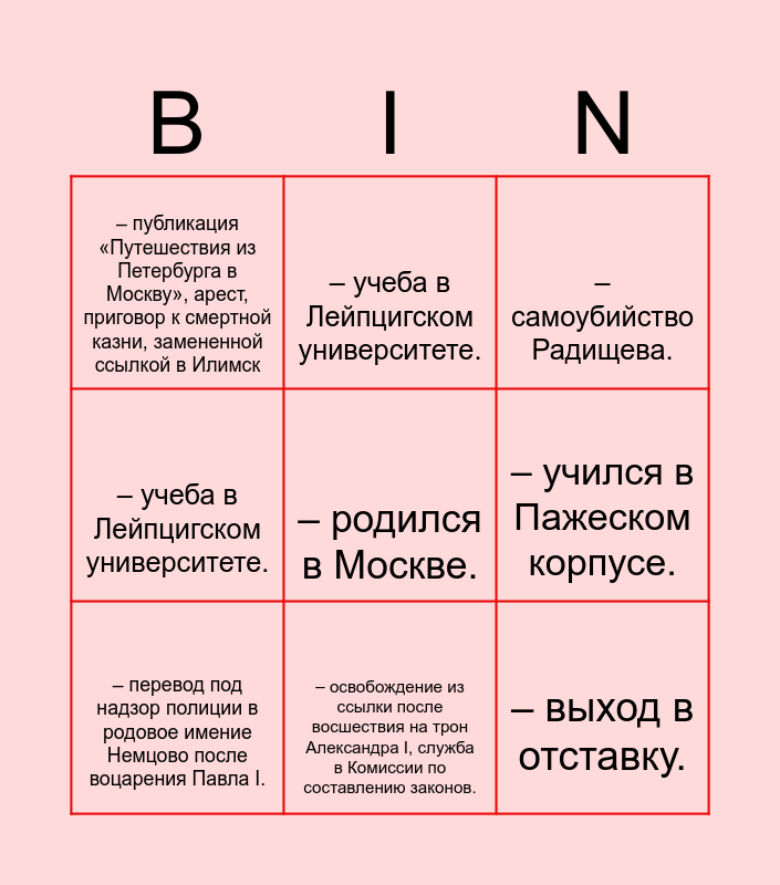 This bingo card has a free space and 8 words: – учился в Пажеском корпусе., – самоубийство Радищева., – учеба в Лейпцигском университете., – перевод под надзор полиции в родовое имение Немцово после воцарения Павла I., – публикация «Путешествия из Петербурга в Москву», арест, приговор к смертной казни, замененной ссылкой в Илимск, – выход в отставку., – учеба в Лейпцигском университете. and – освобождение из ссылки после восшествия на трон Александра I, служба в Комиссии по составлению законов..