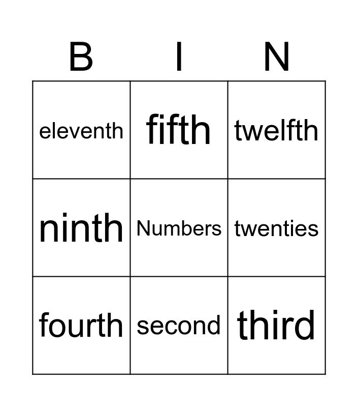 This bingo card has a free space and 11 words: first, second, third, fourth, fifth, twelfth, twenties, eighth, ninth, eleventh and seventh.