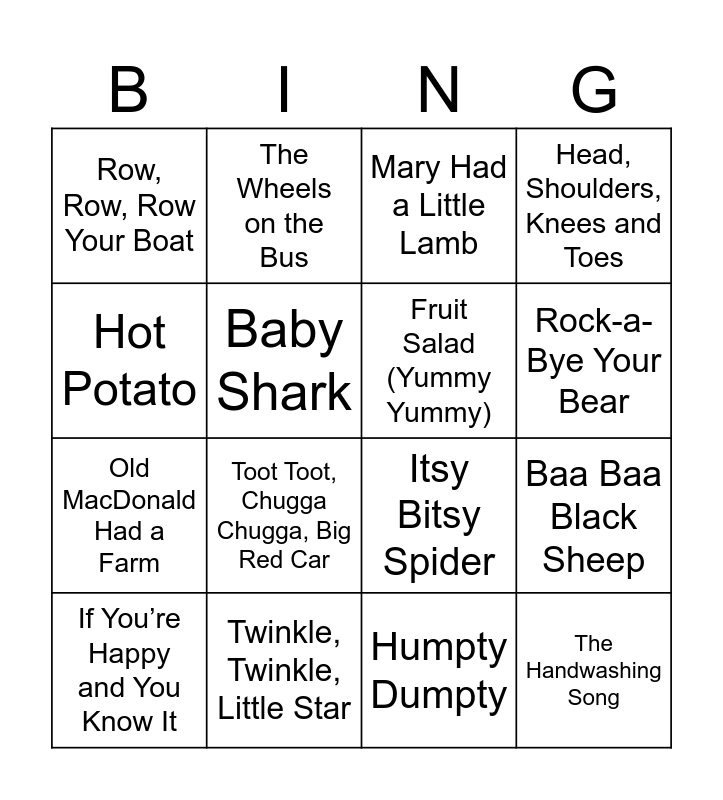 This bingo card has 16 words: Twinkle, Twinkle, Little Star, Baa Baa Black Sheep, Mary Had a Little Lamb, Row, Row, Row Your Boat, Old MacDonald Had a Farm, The Wheels on the Bus, Itsy Bitsy Spider, Humpty Dumpty, Hot Potato, Baby Shark, If You’re Happy and You Know It, Head, Shoulders, Knees and Toes, Toot Toot, Chugga Chugga, Big Red Car, Rock-a-Bye Your Bear, Fruit Salad (Yummy Yummy) and The Handwashing Song.