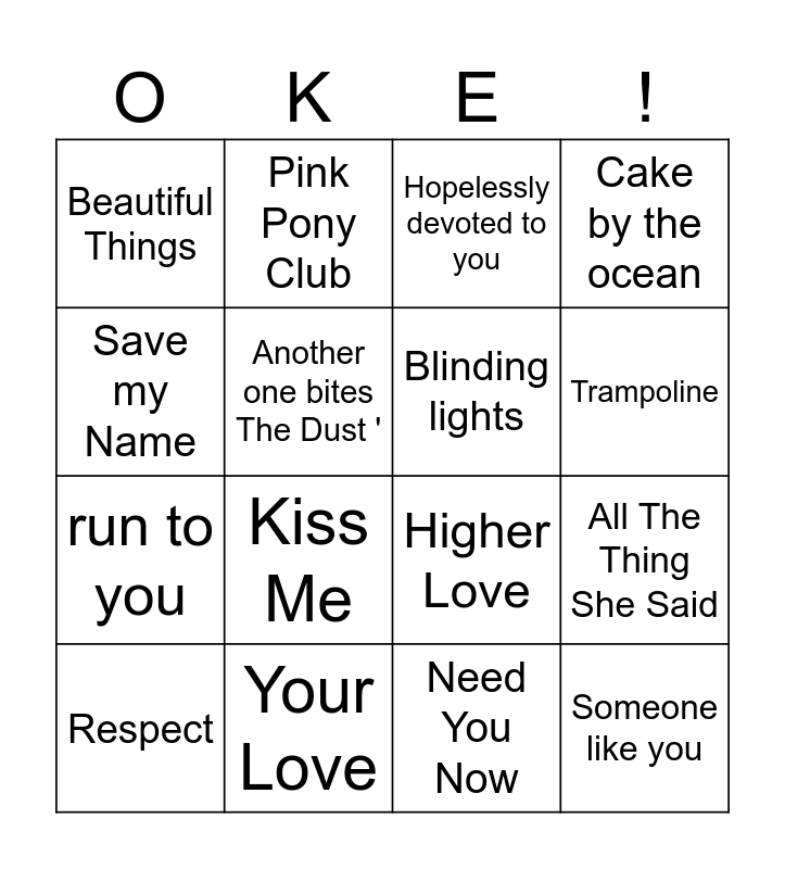 This bingo card has 24 words: Creep, Call out my Name, Trampoline, Shake it out, Save my Name, Beautiful Things, Another one bites The Dust ', Pink Pony Club, Your Love, My Heart will Go On, run to you, Higher Love, Walking on Sunshine, 9 to 5, Blinding lights, I want to Know What love is, Need You Now, Hopelessly devoted to you, Kiss Me, All The Thing She Said, Respect, Someone like you, Cake by the ocean and Save Me.
