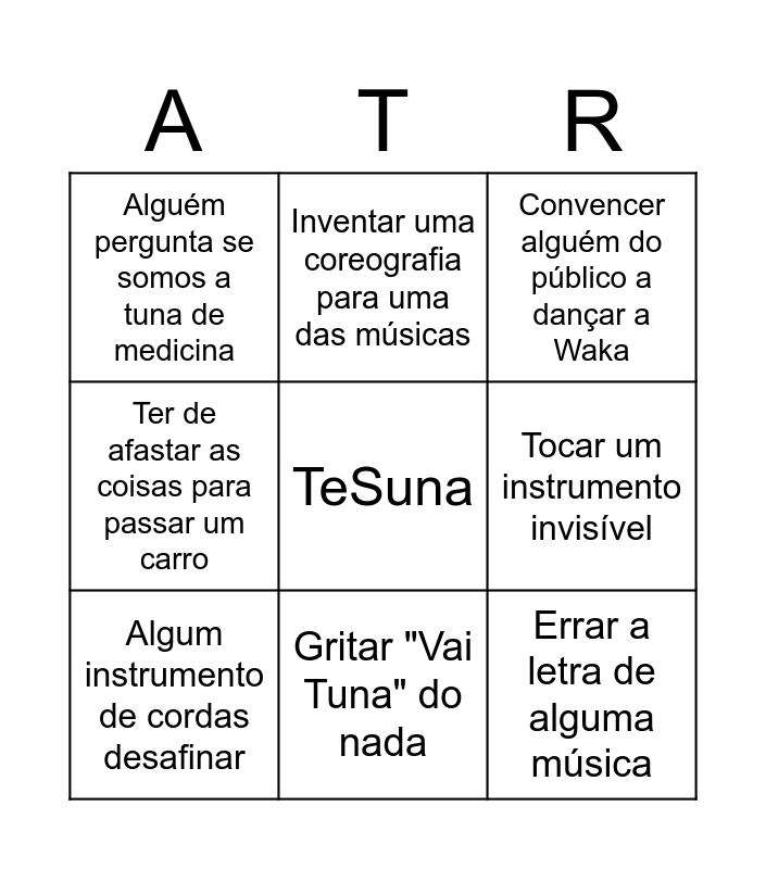 This bingo card has a free space and 16 words: Turista querer tirar foto connosco, Público cantar connosco a música, Convencer alguém do público a dançar a Waka, Alguém pergunta se somos a tuna de medicina, Apresentar a música em 3 línguas diferentes, Inventar uma coreografia para uma das músicas, A percussão atrasar, Alguém entrar no tempo errado, Errar a letra de alguma música, Tocar um instrumento invisível, Convencer alguém a comprar um CD, Ter de afastar as coisas para passar um carro, Fazer uma piada antes de apresentar, Gritar "Vai Tuna" do nada, Algum instrumento de cordas desafinar and Pandeiretas/ Estandartes cair no chão.