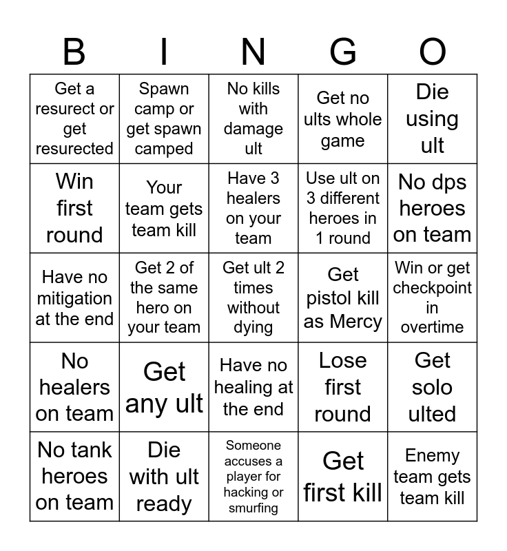 This bingo card has a free space and 24 words: Get any ult, Die with ult ready, Have 3 healers on your team, No tank heroes on team, Die using ult, Get a resurect or get resurected, Win first round, Spawn camp or get spawn camped, Get pistol kill as Mercy, Have no healing at the end, Use ult on 3 different heroes in 1 round, Have no mitigation at the end, Lose first round, Get solo ulted, Your team gets team kill, Get first kill, Win or get checkpoint in overtime, No kills with damage ult, No dps heroes on team, Get 2 of the same hero on your team, Enemy team gets team kill, No healers on team, Get no ults whole game and Someone accuses a player for hacking or smurfing.