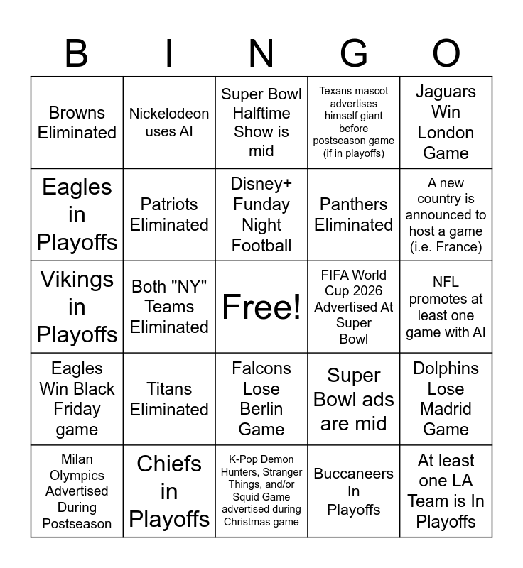 This bingo card has a free space and 24 words: Titans Eliminated, Chiefs in Playoffs, Disney+ Funday Night Football, Milan Olympics Advertised During Postseason, Jaguars Win London Game, Browns Eliminated, Eagles in Playoffs, Nickelodeon uses AI, FIFA World Cup 2026 Advertised At Super Bowl, Falcons Lose Berlin Game, Panthers Eliminated, Vikings in Playoffs, Super Bowl ads are mid, Dolphins Lose Madrid Game, Patriots Eliminated, Buccaneers In Playoffs, NFL promotes at least one game with AI, Super Bowl Halftime Show is mid, A new country is announced to host a game (i.e. France), Both "NY" Teams Eliminated, At least one LA Team is In Playoffs, Eagles Win Black Friday game, Texans mascot advertises himself giant before postseason game (if in playoffs) and K-Pop Demon Hunters, Stranger Things, and/or Squid Game advertised during Christmas game.