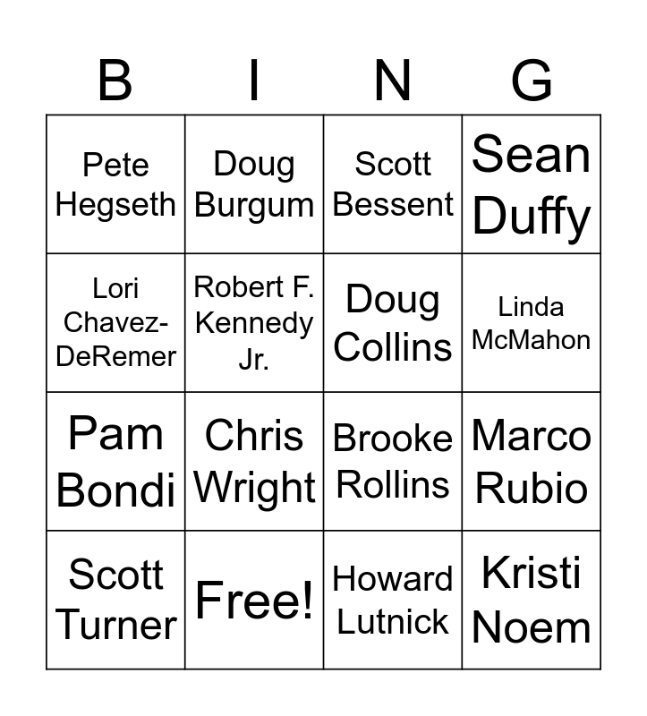 This bingo card has 16 words: Free!, Marco Rubio, Scott Bessent, Pete Hegseth, Pam Bondi, Doug Burgum, Brooke Rollins, Howard Lutnick, Lori Chavez-DeRemer, Robert F. Kennedy Jr., Scott Turner, Sean Duffy, Chris Wright, Linda McMahon, Doug Collins and Kristi Noem.