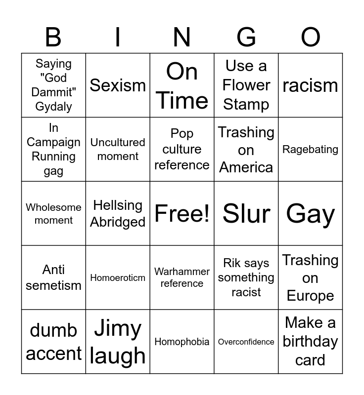 This bingo card has a free space and 24 words: Homoeroticm, Jimy laugh, Pop culture reference, dumb accent, racism, Saying "God Dammit" Gydaly, In Campaign Running gag, Sexism, Slur, Warhammer reference, Trashing on America, Wholesome moment, Rik says something racist, Trashing on Europe, Uncultured moment, Overconfidence, Gay, On Time, Ragebating, Hellsing Abridged, Make a birthday card, Anti semetism, Use a Flower Stamp and Homophobia.
