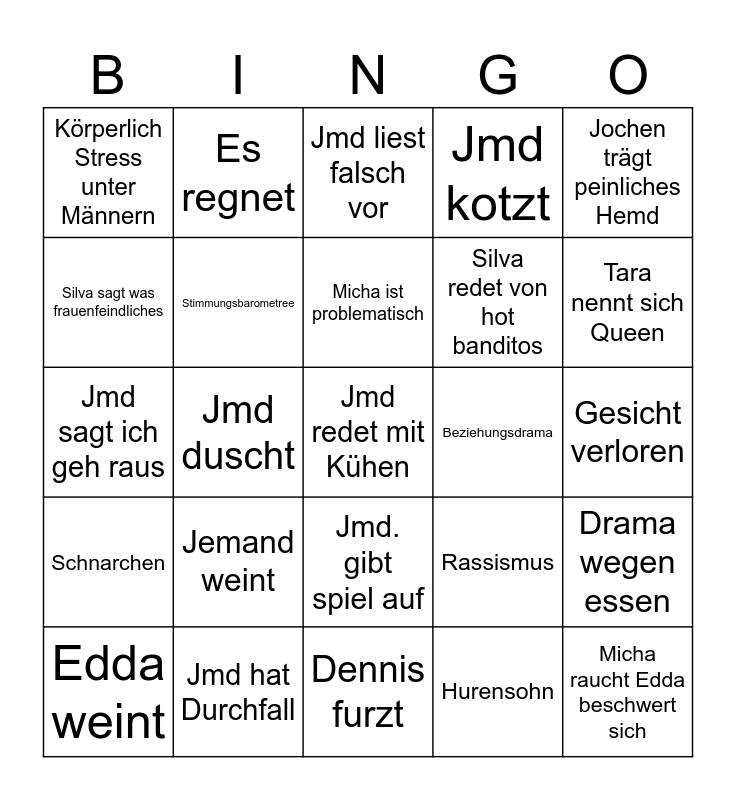 This bingo card has 25 words: Jemand weint, Dennis furzt, Micha ist problematisch, Edda weint, Jochen trägt peinliches Hemd, Körperlich Stress unter Männern, Silva sagt was frauenfeindliches, Es regnet, Beziehungsdrama, Jmd. gibt spiel auf, Silva redet von hot banditos, Jmd sagt ich geh raus, Rassismus, Drama wegen essen, Stimmungsbarometree, Micha raucht Edda beschwert sich, Gesicht verloren, Jmd liest falsch vor, Tara nennt sich Queen, Jmd duscht, Jmd redet mit Kühen, Jmd hat Durchfall, Schnarchen, Jmd kotzt and Hurensohn.