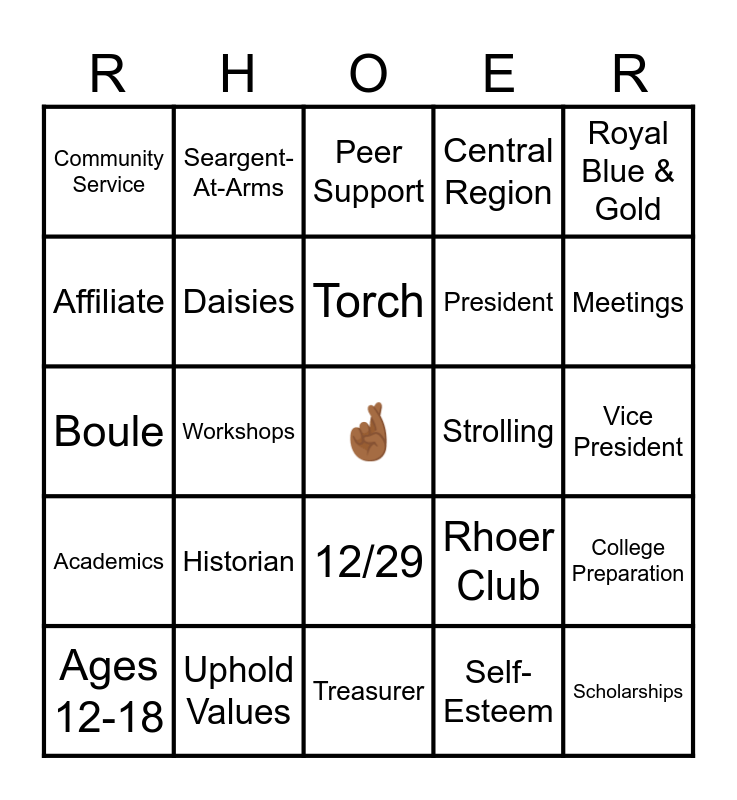 This bingo card has a free space and 35 words: 1939, Monarch Butterfly, Sisters Forever, Daisies, 12/29, Central Region, Affiliate, Rhoer Advisor, Torch, ΑΣΣ Chapter, Boule, Royal Blue & Gold, Leadership, Mentorship, Community Service, Strolling, Self-Esteem, Workshops, Academics, Scholarships, Rhoer Club, Ages 12-18, College Preparation, Uphold Values, Peer Support, Meetings, Heritage, Conference, President, Vice President, Secretary, Treasurer, Historian, Seargent-At-Arms and Gary, IN.