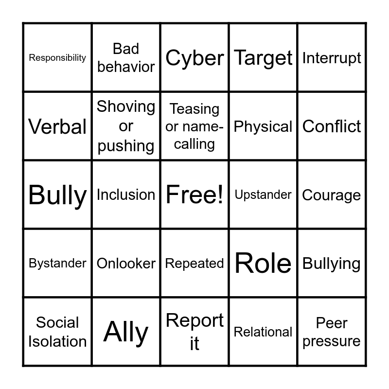 This bingo card has a free space and 28 words: Bullying, Power imbalance, Physical, Relational, Verbal, Cyber, Bad behavior, Bystander, Upstander, Social Isolation, Bully, Target, Ally, Report it, Conflict, Rumors, Onlooker, Shoving or pushing, Teasing or name-calling, Repeated, Responsibility, Kindness, Peer pressure, Inclusion, Courage, Role, Interrupt and Follower.