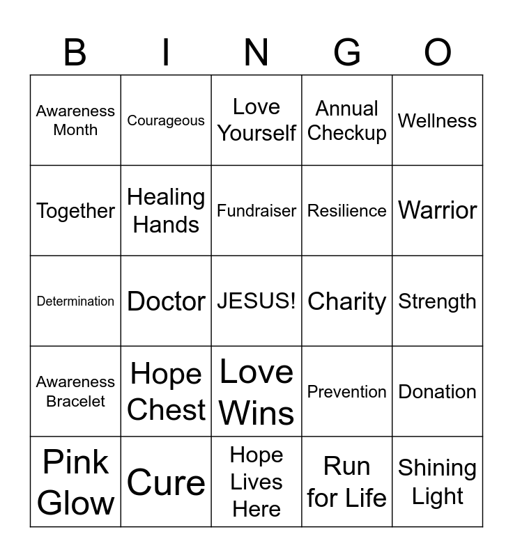 This bingo card has a free space and 100 words: Awareness, Hope, Strength, Courage, Survivor, Fighter, Faith, Love, Pink Ribbon, Mammogram, Early Detection, Screening, Research, Cure, Support, Unity, Resilience, Empower, Inspire, Advocate, Journey, Healing, Family, Friends, Community, Charity, Wellness, Prevention, Education, Self-Exam, Doctor, Awareness Month, October, Walk for the Cure, Run for Life, Fundraiser, Donation, Volunteer, Pink Power, Faith Over Fear, Beautiful, Brave, Determination, Sisterhood, Warrior, Love Yourself, Health, Medical Team, Awareness Ribbon, Hope Lives Here, Believe, Family Support, Positive Energy, Celebration, Butterfly, Miracle, Caregiver, Pink Party, Awareness Day, Annual Checkup, Strength in Numbers, Healing Journey, Pink Parade, Radiate Hope, Pink Out, Breast Health, Be Bold, Support Group, Never Give Up, Power in Pink, Inspire Change, Hope Chest, Think Pink, Faithful, Awareness Walk, Pink Powerhouse, Smile, Together, Gratitude, Wellness Check, Brave Heart, Shining Light, Never Alone, Love Wins, Pink Hearts, Courageous, Health Advocate, Breast Exam, Kindness, Awareness Bracelet, Pink Ribbon Pin, Monthly Check, Hope Wall, Pink Glow, Healing Hands, Pink Promise, Spirit of Hope, Brave Soul, Awareness Event and We Fight Together.