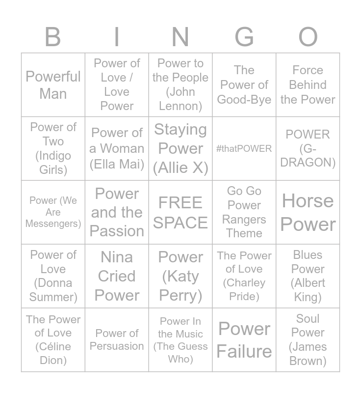 This bingo card has a free space and 74 words: Power (Kanye West), The Power (Snap!), Power to the People (John Lennon), Power to the Power (Public Enemy), Power to the Power (Black Eyed Peas), Power to the People (Joe Henderson), Power to the People (Curtis Mayfield), The Power of Love (Huey Lewis & the News), The Power of Love (Céline Dion), People Have the Power, Staying Power (Barry White), Staying Power (Queen), Staying Power (Allie X), Power of Two (Indigo Girls), Power of Two (Mr Twin Sister), Power and the Passion, Power (Little Mix), POWER (G-DRAGON), Power (Ellie Goulding), Power (We Are Messengers), Power of a Woman (Ella Mai), Power of Love / Love Power, The Power of Good-Bye, Power of My Love, Soul Power (James Brown), Star Power (Sonic Youth), Power (Marshmello), Power (Bastille), Higher Power, Unseen Power of the Picket Fence, Force Behind the Power, Love Power (Willie Hutch), Love Power (Dionne Warwick), Magic Power, Mind Power, Power Failure, Power Play (Eddie and the Tide), Power Play (Etta James), Power Play (Steppenwolf), Power Play (Molly Hatchet), Power In the Music (The Guess Who), Power of Persuasion, Powerful (Major Lazer), Powerful (Empire), Powerful Women, Powerful Man, Power is Power, Nina Cried Power, The Power of Love (Jennifer Rush), Solar Power, Power of a Woman, We Got the Power (Gorillaz), Horse Power, The Power of Love (Frankie Goes to Hollywood), Power Up, Powerful Thing, Power (Katy Perry), Fight the Power, Pts. 1 & 2, Blues Power (Eric Clapton), Blues Power (Albert King), #thatPOWER, Heaven, Heartache and the Power of Love, Power of Love (Donna Summer), New Power Generation, Go Go Power Rangers Theme, Power (Leona Lewis), Brainpower, (You Got) The Power of Love, The Power of Love (Charley Pride), Truth to Power, MY POWER, He's Got the Power, We Got the Power (Zayde Wolf) and Two to the Power of Love.