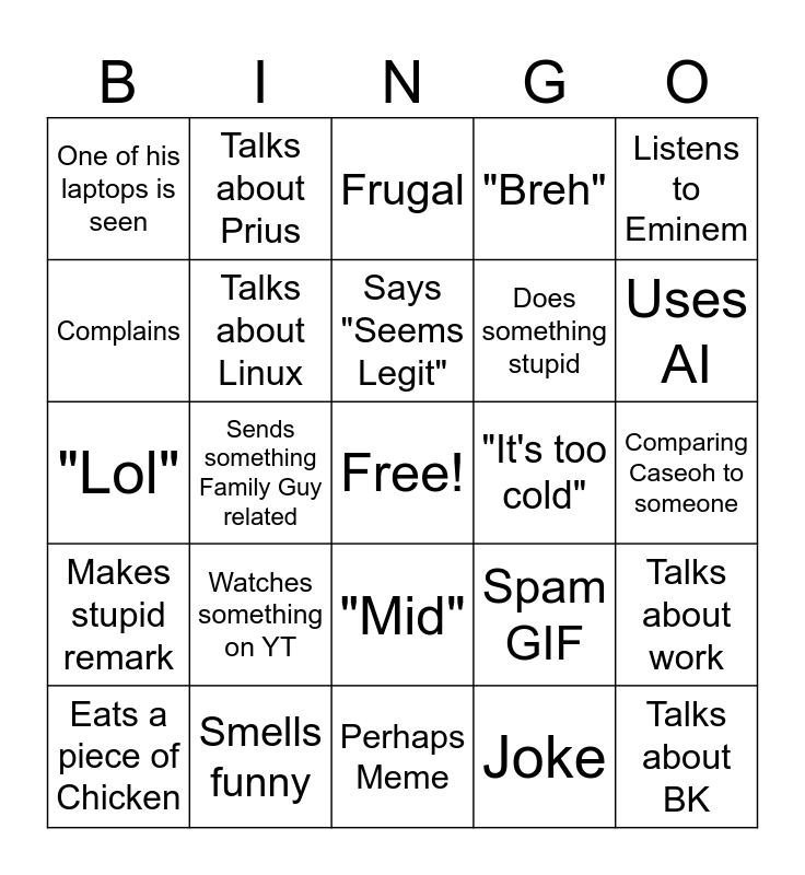 This bingo card has a free space and 24 words: Watches something on YT, Smells funny, Says "Seems Legit", Eats a piece of Chicken, Listens to Eminem, One of his laptops is seen, Complains, Talks about Prius, "It's too cold", "Mid", Does something stupid, "Lol", Spam GIF, Talks about work, Talks about Linux, Joke, Comparing Caseoh to someone, Frugal, Uses AI, Sends something Family Guy related, Talks about BK, Makes stupid remark, "Breh" and Perhaps Meme.