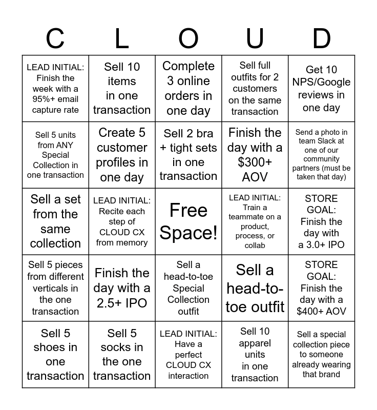 This bingo card has a free space and 24 words: Finish the day with a 2.5+ IPO, Sell 5 socks in the one transaction, Sell 2 bra + tight sets in one transaction, Sell 5 shoes in one transaction, Get 10 NPS/Google reviews in one day, LEAD INITIAL: Finish the week with a 95%+ email capture rate, Sell 5 units from ANY Special Collection in one transaction, Sell 10 items in one transaction, LEAD INITIAL: Train a teammate on a product, process, or collab, Sell a head-to-toe Special Collection outfit, Finish the day with a $300+ AOV, Sell a set from the same collection, Sell a head-to-toe outfit, STORE GOAL: Finish the day with a $400+ AOV, Create 5 customer profiles in one day, Sell 10 apparel units in one transaction, STORE GOAL: Finish the day with a 3.0+ IPO, Complete 3 online orders in one day, Send a photo in team Slack at one of our community partners (must be taken that day), LEAD INITIAL: Recite each step of CLOUD CX from memory, Sell a special collection piece to someone already wearing that brand, Sell 5 pieces from different verticals in the one transaction, Sell full outfits for 2 customers on the same transaction and LEAD INITIAL: Have a perfect CLOUD CX interaction.
