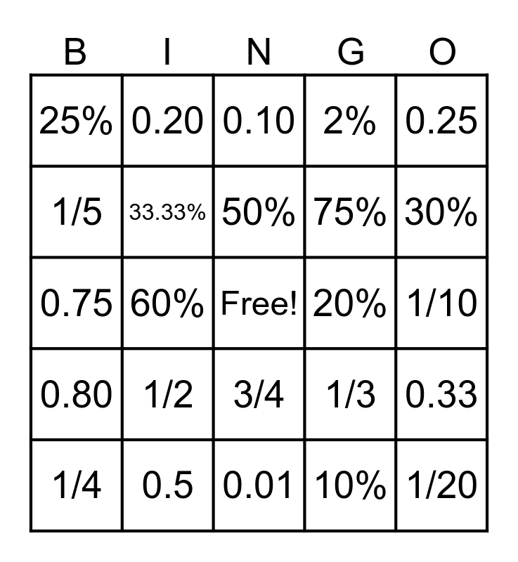 This bingo card has a free space and 24 words: 1/2, 0.5, 50%, 1/4, 0.25, 25%, 1/5, 0.20, 20%, 3/4, 75%, 0.75, 1/3, 0.33, 33.33%, 10%, 1/10, 0.10, 30%, 60%, 1/20, 0.80, 2% and 0.01.
