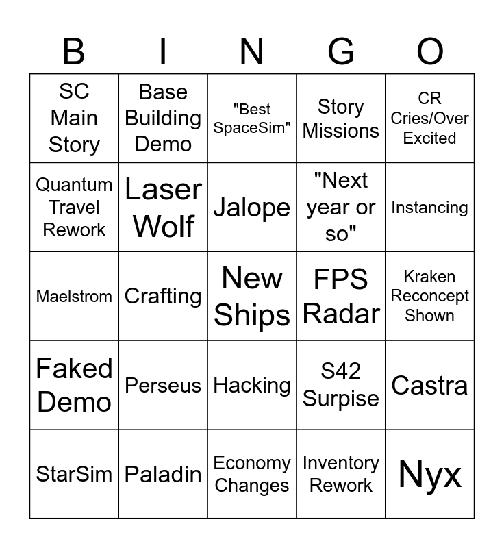 This bingo card has a free space and 47 words: MT with planet tech v5, Nyx, "I held the line", Economy Changes, Perseus, Elliot Cringe, Base Building Demo, Dynamic Meshing, Quantum Travel Rework, Disco Monologue, Laser Wolf, Story Missions, Castra, S42 Surpise, VOIP Update, New Social Mobi App, Jalope, FPS Radar, Engineering Demo, CR Cries/Over Excited, Crafting, Inventory Rework, SC Main Story, "Next year or so", New Fauna, Instancing, StarSim, New "Star"Tech, Hacking, Faked Demo, New Flight Model, "Bespoke", MISC Raptor, Boss Fight, StarWear, Paladin, Kraken Reconcept Shown, Terra, T1 Item Recovery, New Log Out System, Mission Givers, "Best SpaceSim", Maelstrom, Bounty Hunting 2.0, Map Markers, Player Trading and Map Markers.