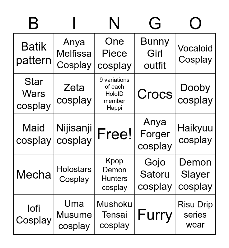 This bingo card has a free space and 24 words: Holostars Cosplay, Uma Musume cosplay, 9 variations of each HoloID member Happi, Iofi Cosplay, Vocaloid Cosplay, Batik pattern, Star Wars cosplay, Anya Melfissa Cosplay, Anya Forger cosplay, Kpop Demon Hunters cosplay, Crocs, Maid cosplay, Gojo Satoru cosplay, Demon Slayer cosplay, Zeta cosplay, Furry, Haikyuu cosplay, One Piece cosplay, Dooby cosplay, Nijisanji cosplay, Risu Drip series wear, Mecha, Bunny Girl outfit and Mushoku Tensai cosplay.