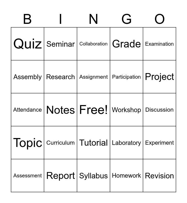 This bingo card has a free space and 25 words: Curriculum, Syllabus, Assignment, Assessment, Examination, Quiz, Assembly, Seminar, Workshop, Tutorial, Participation, Attendance, Laboratory, Experiment, Research, Presentation, Discussion, Collaboration, Project, Notes, Revision, Report, Topic, Grade and Homework.