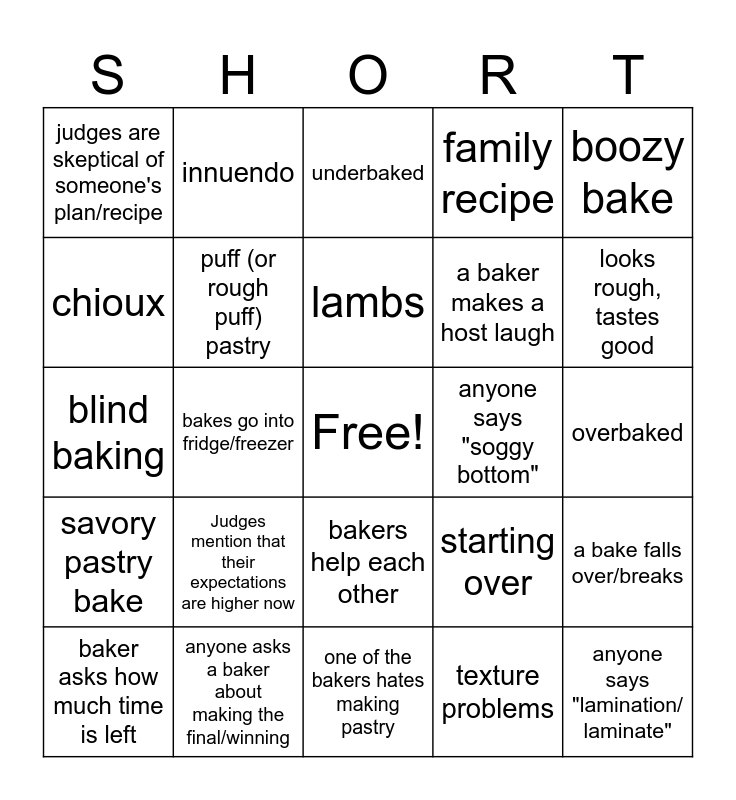 This bingo card has a free space and 24 words: Judges mention that their expectations are higher now, anyone asks a baker about making the final/winning, lambs, baker asks how much time is left, boozy bake, judges are skeptical of someone's plan/recipe, chioux, innuendo, anyone says "soggy bottom", bakers help each other, a baker makes a host laugh, blind baking, starting over, a bake falls over/breaks, puff (or rough puff) pastry, texture problems, overbaked, underbaked, looks rough, tastes good, bakes go into fridge/freezer, anyone says "lamination/ laminate", savory pastry bake, family recipe and one of the bakers hates making pastry.