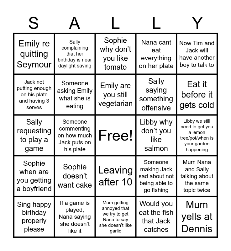 This bingo card has a free space and 24 words: Sing happy birthday properly please, Sophie doesn't want cake, Emily are you still vegetarian, Would you eat the fish that Jack catches, Now Tim and Jack will have another boy to talk to, Emily re quitting Seymour, Sally complaining that her birthday is near daylight saving, Sophie why don’t you like tomato, Libby why don’t you like salmon, Libby we still need to get you a lemon tree/pot/when is your garden happening, Sally requesting to play a game, Someone asking Emily what she is eating, Someone making Jack sad about not being able to go fishing, Mum Nana and Sally talking about the same topic twice, Jack not putting enough on his plate and having 3 serves, If a game is played, Nana saying she doesn’t like it, Mum getting annoyed that we try to get Nana to say she doesn’t like garlic, Nana cant eat everything on her plate, Eat it before it gets cold, Sophie when are you getting a boyfriend, Someone commenting on how much Jack puts on his plate, Leaving after 10, Sally saying something offensive and Mum yells at Dennis.