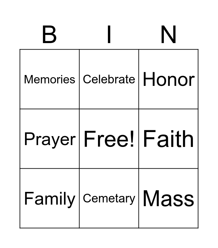 This bingo card has a free space and 14 words: Souls, November, Family, Celebrate, Prayer, Mass, Candles, Hope, Cemetary, Memories, Purgatory, Faith, Honor and Feast.
