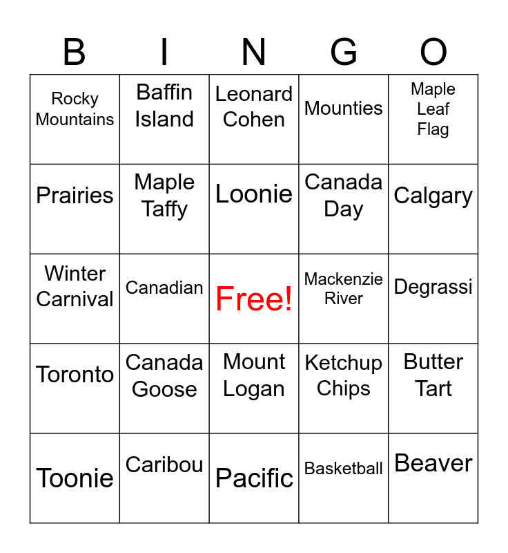 This bingo card has a free space and 24 words: Canada Goose, Caribou, Loonie, Toonie, Maple Leaf Flag, Rocky Mountains, Prairies, Baffin Island, Mackenzie River, Mount Logan, Canada Day, Winter Carnival, Ketchup Chips, Butter Tart, Maple Taffy, Basketball, Degrassi, Leonard Cohen, Calgary, Canadian, Beaver, Toronto, Mounties and Pacific.