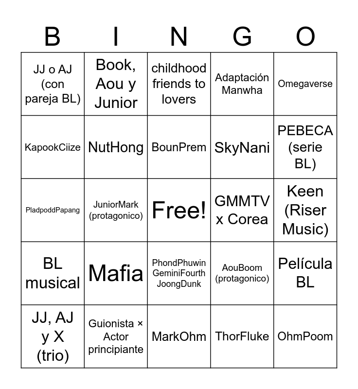 This bingo card has a free space and 24 words: Mafia, Guionista × Actor principiante, BounPrem, JJ, AJ y X (trio), Omegaverse, JJ o AJ (con pareja BL), KapookCiize, Book, Aou y Junior, GMMTV x Corea, PhondPhuwin GeminiFourth JoongDunk, SkyNani, PladpoddPapang, AouBoom (protagonico), Película BL, NutHong, ThorFluke, Keen (Riser Music), childhood friends to lovers, PEBECA (serie BL), JuniorMark (protagonico), OhmPoom, BL musical, Adaptación Manwha and MarkOhm.
