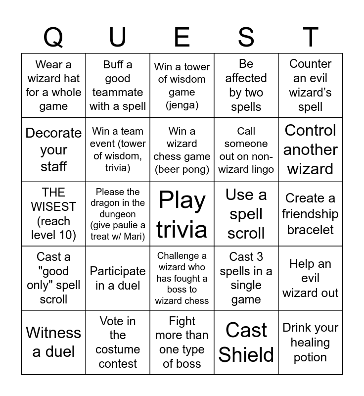 This bingo card has 32 words: Cast Shield, Give someone their healing potion, Please the dragon in the dungeon (give paulie a treat w/ Mari), Cast 3 shape waters, Cast a "good only" spell scroll, Win a team event (tower of wisdom, trivia), Counter an evil wizard’s spell, Help an evil wizard out, Buff a good teammate with a spell, Drink your healing potion, Win a wizard chess game (beer pong), Win a tower of wisdom game (jenga), Win 3 tower of wisdom games, Cast 3 unique spells, Use a spell scroll, Feel wise (reach level 5), Witness a duel, THE WISEST (reach level 10), Challenge a wizard who has fought a boss to wizard chess, Participate in a duel, Cast 3 spells in a single game, Trade spell scrolls with another character, Create a friendship bracelet, Vote in the costume contest, Play trivia, Be affected by two spells, Call someone out on non-wizard lingo, Decorate your staff, Wear a wizard hat for a whole game, Fight more than one type of boss, Cast 10 spells total and Control another wizard.