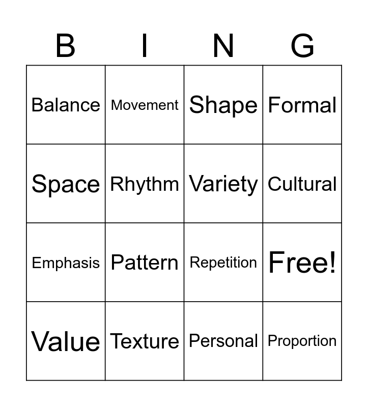 This bingo card has 20 words: Free!, Line, Shape, Colour, Value, Space, Texture, Balance, Emphasis, Movement, Pattern, Repetition, Rhythm, Proportion, Variety, Unity, Cultural, Formal, Personal and Contempory.