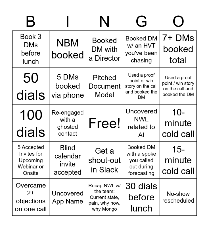 This bingo card has a free space and 24 words: Blind calendar invite accepted, Uncovered App Name, Pitched Document Model, Overcame 2+ objections on one call, 7+ DMs booked total, Book 3 DMs before lunch, 50 dials, NBM booked, Uncovered NWL related to AI, Get a shout-out in Slack, Used a proof point or win story on the call and booked the DM, 100 dials, Booked DM with a spoke you called out during forecasting, 15-minute cold call, 5 DMs booked via phone, 30 dials before lunch, 10-minute cold call, Booked DM with a Director, Used a proof point / win story on the call and booked the DM, Re-engaged with a ghosted contact, No-show rescheduled, 5 Accepted Invites for Upcoming Webinar or Onsite, Booked DM w/ an HVT you've been chasing and Recap NWL w/ the team: Current state, pain, why now, why Mongo.
