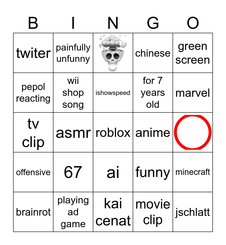 This bingo card has 2 images, a free space and 22 words: 67, playing ad game, ishowspeed, brainrot, green screen, twiter, pepol reacting, painfully unfunny, anime, ai, for 7 years old, tv clip, funny, minecraft, wii shop song, movie clip, marvel, asmr, jschlatt, offensive, chinese and kai cenat.