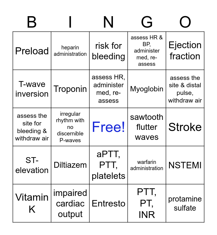 This bingo card has a free space and 24 words: Diltiazem, impaired cardiac output, assess HR, administer med, re-assess, Vitamin K, Ejection fraction, Preload, T-wave inversion, heparin administration, sawtooth flutter waves, aPTT, PTT, platelets, Myoglobin, assess the site for bleeding & withdraw air, warfarin administration, NSTEMI, Troponin, PTT, PT, INR, Stroke, risk for bleeding, assess the site & distal pulse, withdraw air, irregular rhythm with no discernible P-waves, protamine sulfate, ST-elevation, assess HR & BP, administer med, re-assess and Entresto.