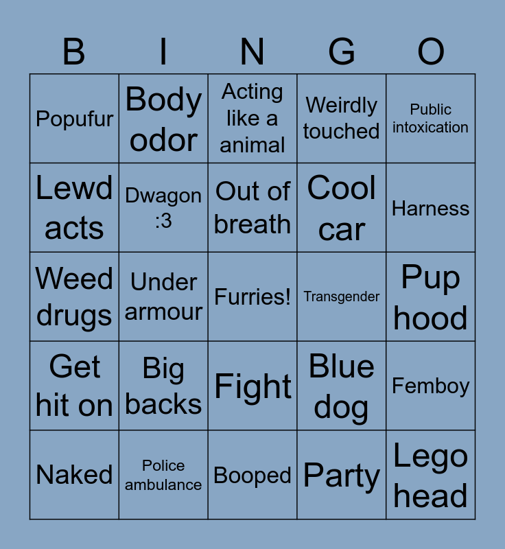 This bingo card has a free space and 24 words: Big backs, Police ambulance, Out of breath, Naked, Public intoxication, Popufur, Lewd acts, Body odor, Transgender, Fight, Cool car, Weed drugs, Blue dog, Femboy, Dwagon :3, Party, Pup hood, Acting like a animal, Harness, Under armour, Lego head, Get hit on, Weirdly touched and Booped.