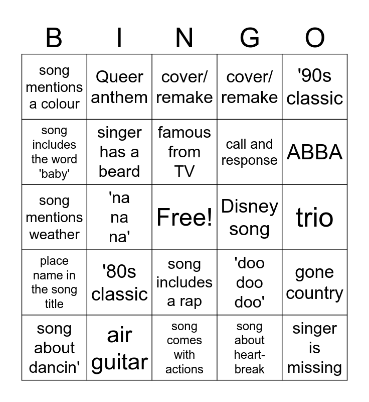 This bingo card has a free space and 25 words: '80s classic, song comes with actions, famous from TV, song about dancin', '90s classic, song mentions a colour, song includes the word 'baby', Queer anthem, Disney song, song includes a rap, call and response, song mentions weather, 'doo doo doo', gone country, singer has a beard, duet, trio, cover/ remake, ABBA, 'na na na', singer is missing, air guitar, place name in the song title, cover/ remake and song about heart- break.